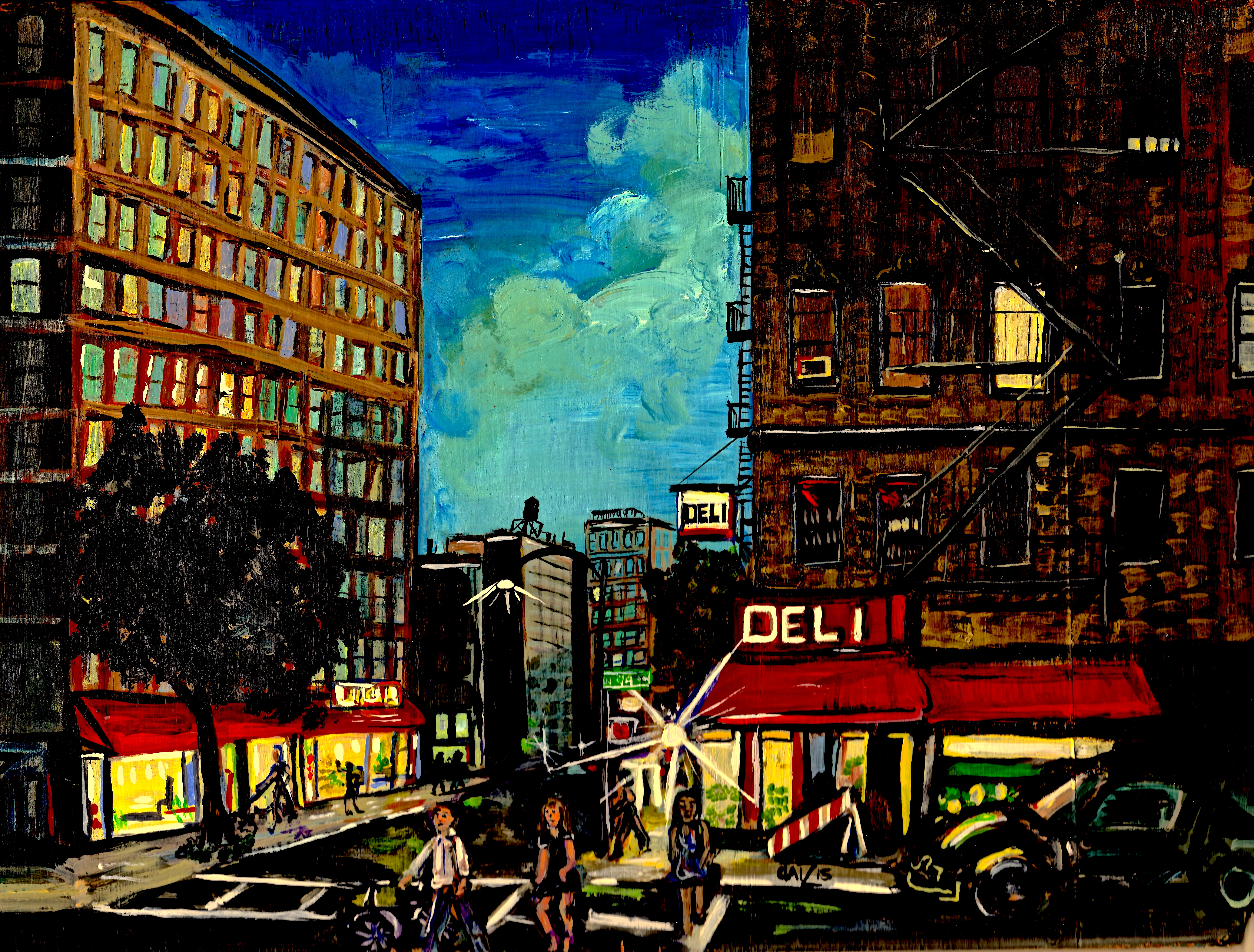 Corner Deli. 94th and Amsterdam. (on the corner from the studio) Acrylic on Wood 18″x24″ Multi colored windows and stark contrast creating an air of mystery that could not have been achieved without abstracting from the realism possibilities here. I was looking for a glow