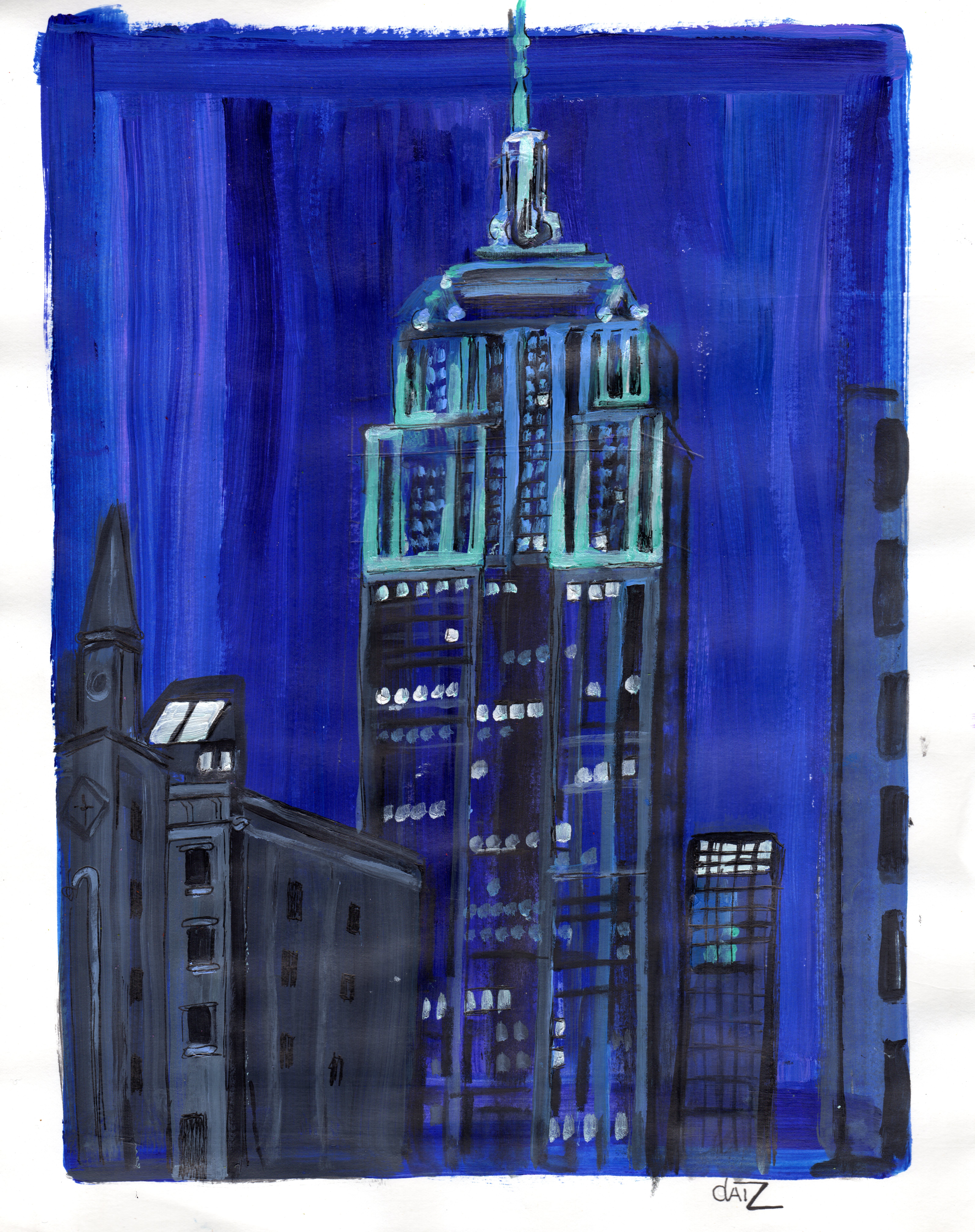 Empire Blue Night. Acrylic on Paper 2015. painterly brush strokes and unfinished edges and lines combined with an almost Royal blue give this landscape/ cityscape a noble darkness that i desired.