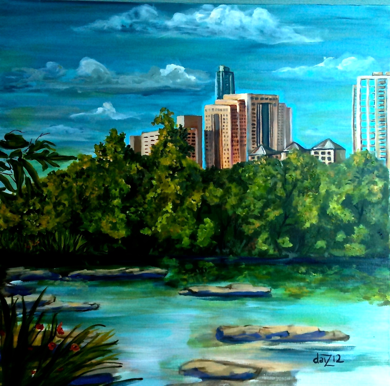 Notice here how I used a solid bold color to represent the city. I chose orange for many reasons but, most importantly, the very nature of orange is vibrant, up beat, alive, joyful, proud and simple. All of the feelings I was having about this economically booming and growing city. I also, needed to touch the canvas with something vibrantly naturally growing and thus the close up of the leaves growing so closely on the shore. I felt the balance of this paintings realism and abstraction proved to be exemplary of my point in this rambling blog about my work. I am including more Austin Texas work followed by some of my newer New York City work to expose the development of this theory.