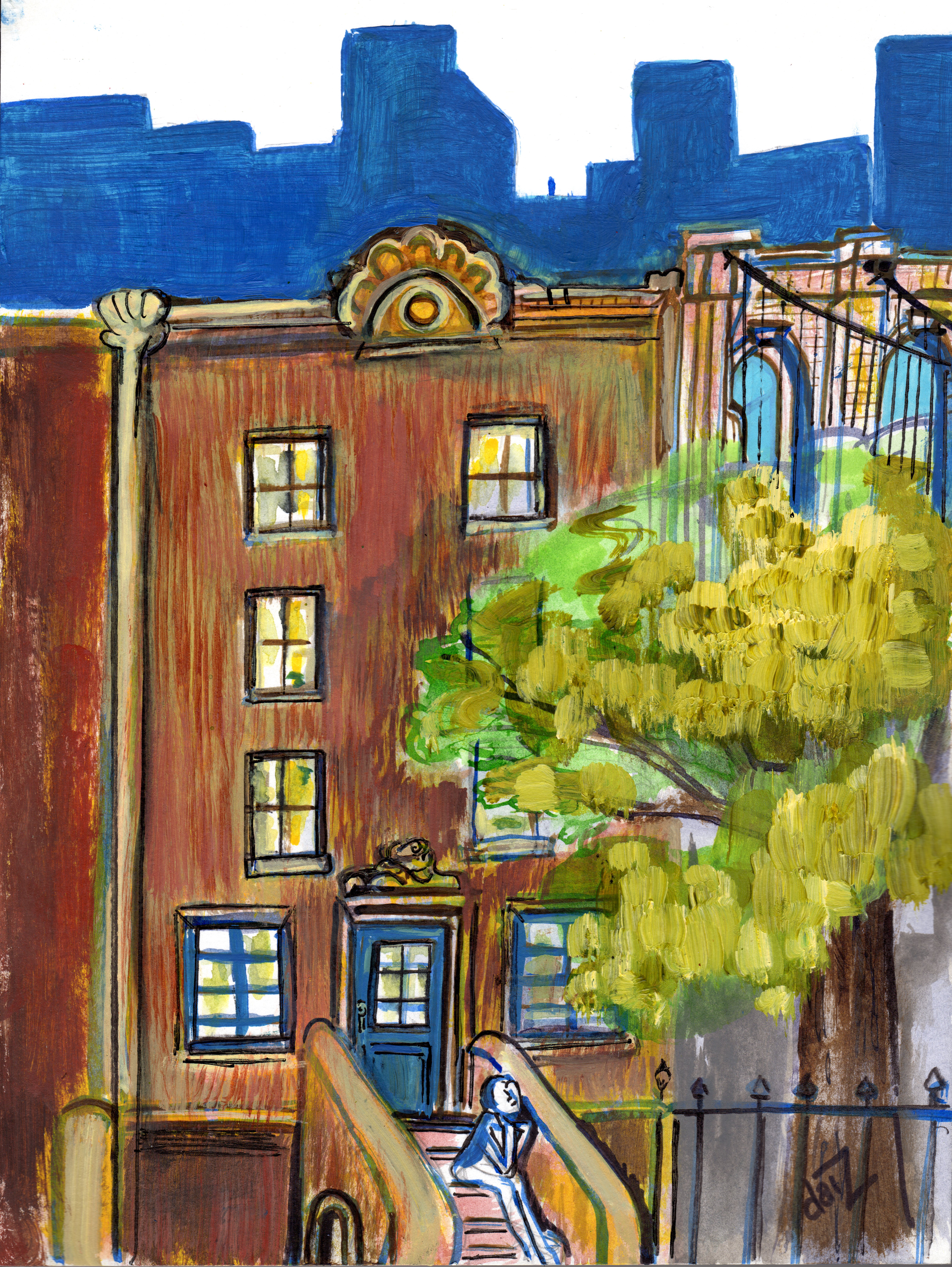 Stoop Dreamin’ – Acrylic on Paper 2014. Nameless and faceless Brooklyn afternoons. Simple and Carefree. The “Yankees” blue city skyline contrasted with the brushy soft tree and the lack of focus. This mood would have been ruined with definition.