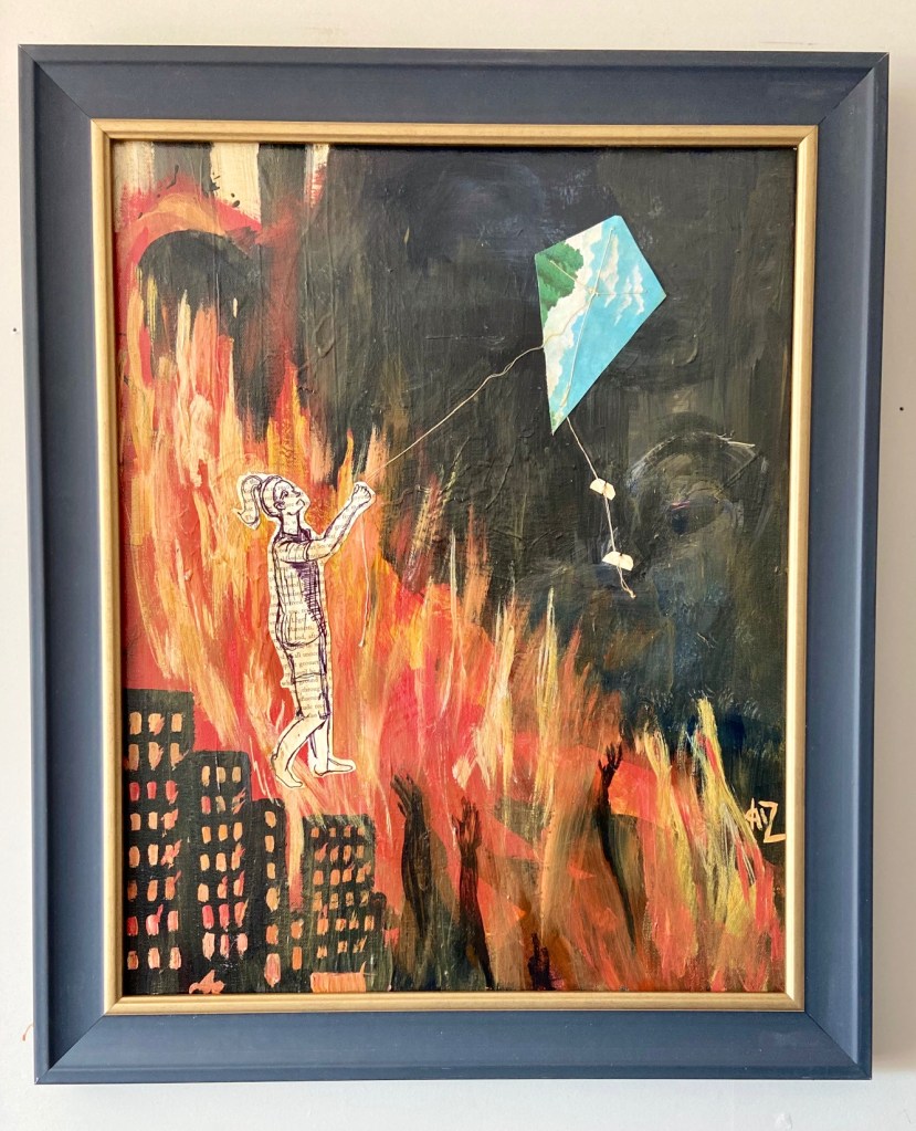Stitched into the canvas is the image of a small white woman flying a kite. She is made of old paper and standing in the middle of the fire. Her right heel is already singed, her face remains inscrutable. The kite evokes a calm, sunny afternoon.