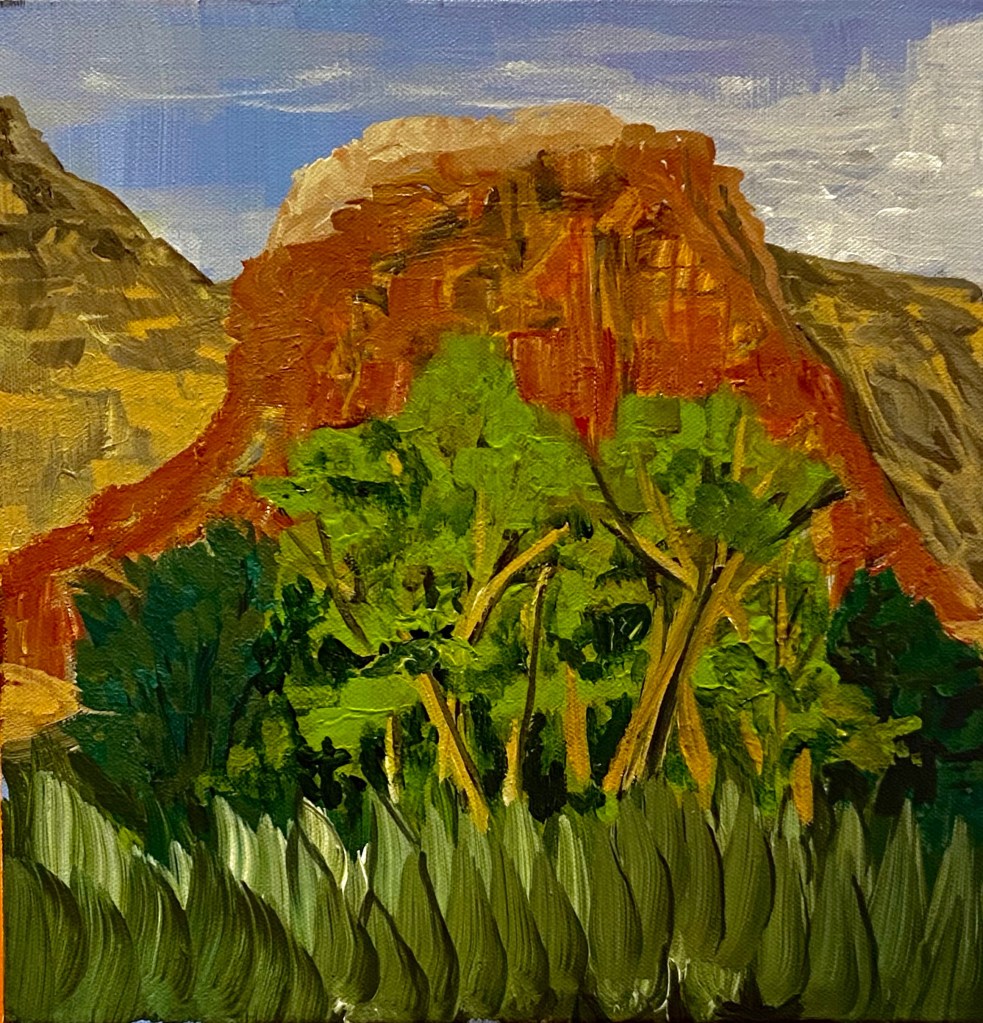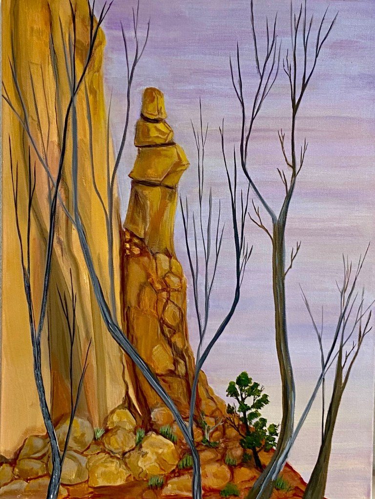 Fascinated by these strange and unbelievable rock formations, I felt compelled to capture this one which faces east as if standing guard. The mysterious, giant, and precariously balanced shapes are so common in these mountains that I could not resist giving them names and painting them as figures. This is the piece I was carrying when I faced off with the bobcat. I had been told that if I ever encountered a wild cat not to run but, to stand my ground and make myself as big as possible. I stood with my straw hat in one hand and this canvas, a finished painting of the violet morning sky, in the other, arms extended and eyes steady on the cat.