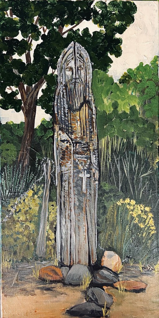 An old tree chainsaw sculpture of St. Francis stands at the northern entrance to the labyrinth garden. I passed this sculpture 5 or 6 times a day always stopping to say hello or leave a small flower in his hands. He was a companion in the wilderness. I loved how his head was just split right open at the top. He was coming undone and becoming more interesting.