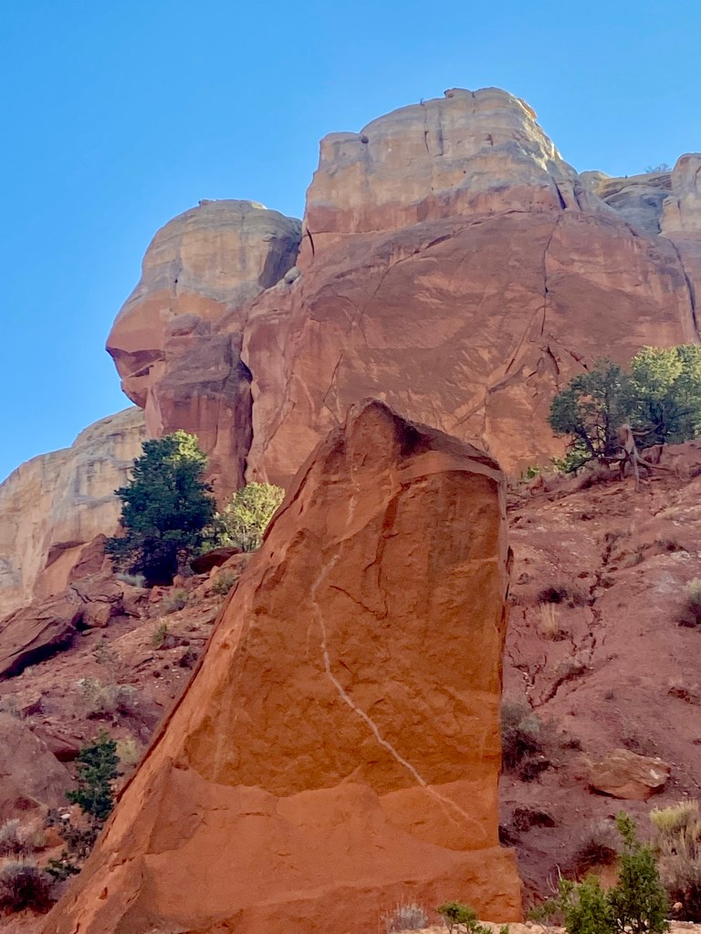 In the arroyo behind and below the labyrinth there is a creek bed and a path that is hidden. A green damp path wanders thru a dense cottonwood grove with views looking up at Kitchen Mesa. Catching a glimpse of the giant rock formations thru the trees I imagined them as lovers entwined in a secret embrace.