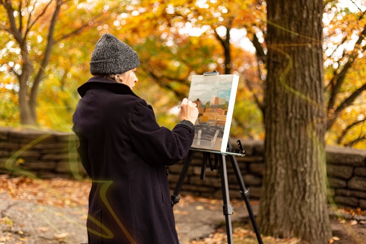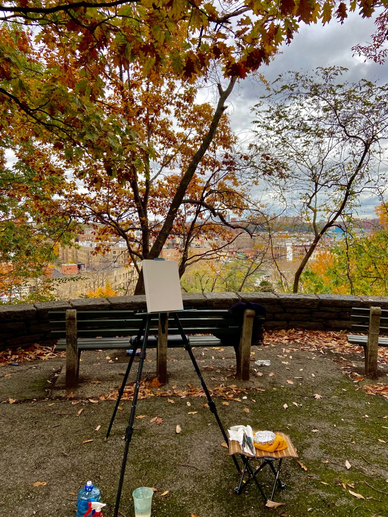 In gorgeous Fort Tryon park on 11/15/21. My dear friend, artist photographer Carol Forman, http://tiny.cc/qazluz and I wandered the many paths around the autumnal paradise of Ft. Tryon on this chilly Monday waiting for inspiration to strike. I became enamored with this view thru the leaves to the city below. It did take long for me to realize that the empty park bench was compositionally imperative to understand the view in context. The bench is a comforting anchor at the base of this small painting.