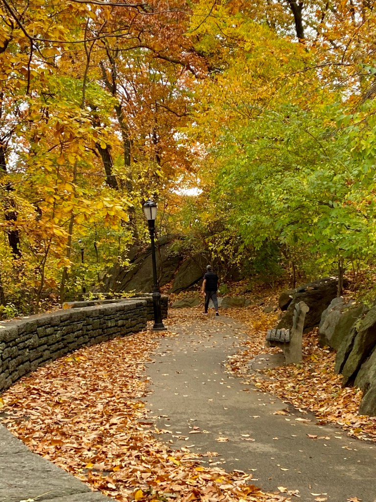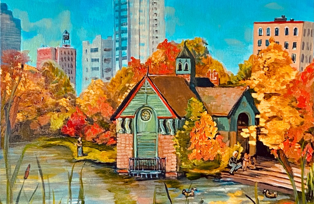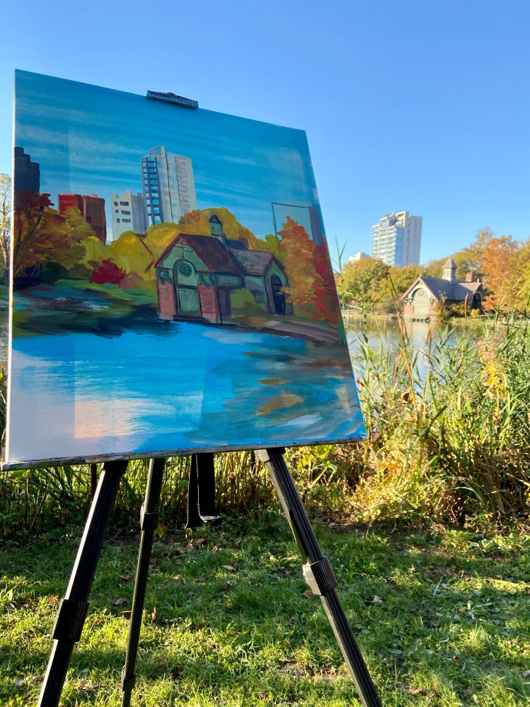 This painting of The Harlem Meer began as a plein air piece however, sadly; I ran out of daylight. I took a number of photos at about 4pm on 11/8, as I was wrapping up my supplies. I finished this piece based on my own photos in my Harlem studio on Thanksgiving day. With all of this time to consider this work in progress, I decided to add myself and my beloved Blue as figures by the pond. I lost this great love of mine on May 11th 2021. He was almost 16 and we were together all of those years. The most handsome and sweet pitbull on the planet… there we are watching the ducks on the pond. I will remember him for the rest of my life. My dearest love, my Blue.