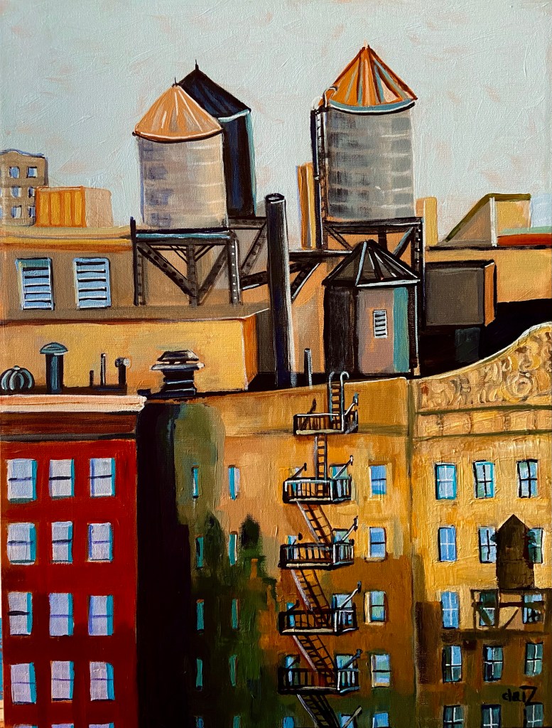 Here is the most recent a painting that is 18” x 24”. It grew slowly day by day with little additions every morning around 8 AM in the clear morning light. Here is the view from my studio window- looking south towards lower Manhattan. These buildings are on 142nd St. between Broadway and Riverside Drive on the south side of the street.