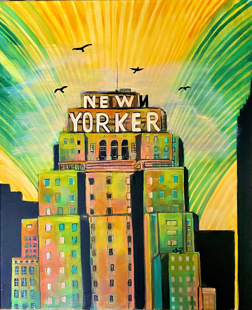 I began with this painting really feeling the Art Deco qualities of the New Yorker hotel. The sky is a motif common in Art Deco, as a sunburst of green and gold sunshine. A light cloud cover and the quintessential New York pigeons flying around the top of this iconic monument to Art Deco.
